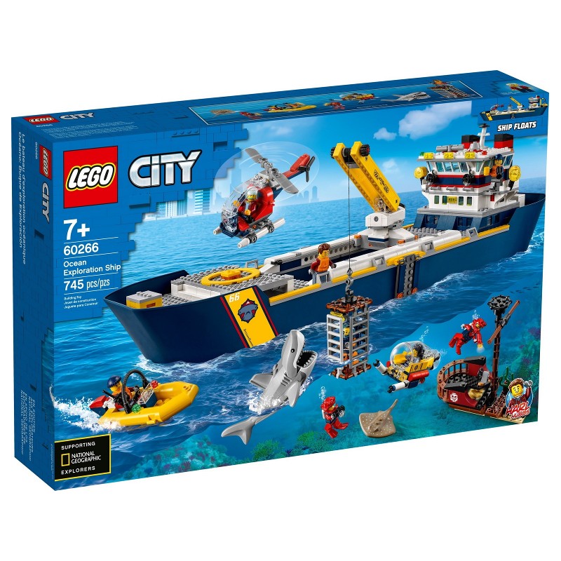 Vyplujte na širé moře na palubě úžasné oceánské průzkumné lodi LEGO® City. Přidejte se k hrdinovi televizního seriálu LEGO City Adventures Harlu Hubbsovi a týmu průzkumníků na vzrušujícím dobrodružství. Pro lepší rozhled můžete vzlétnout z lodi v parádní helikoptéře. Lodním jeřábem pak můžete spustit do moře klec pro pozorování žraloků nebo vypustit výzkumnou ponorku. Pak se ponořte do hlubin a prozkoumejte záhadný vrak v hlubinách moře.